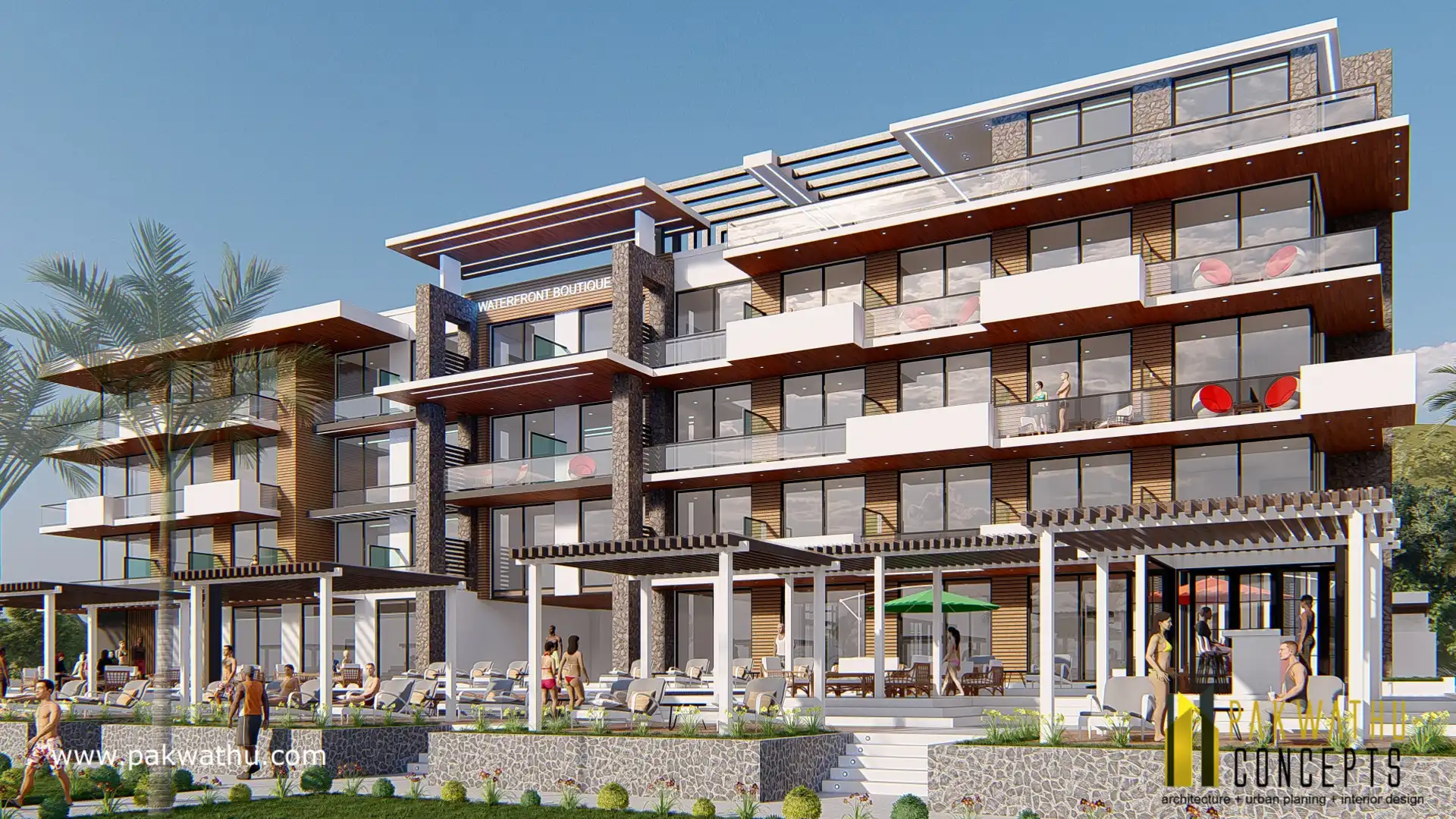 A sleek design with horizontal timber cladding and rough stone-clad walls, accented by cantilevered balconies with lush planters
