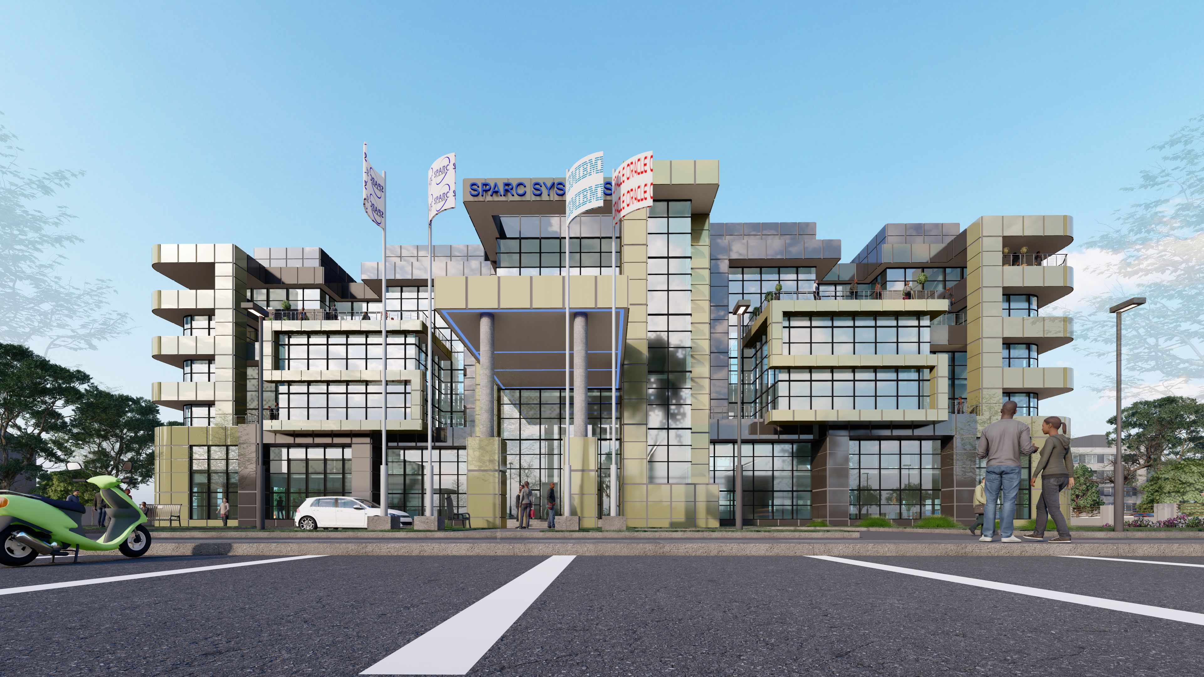 Contemporary and traditional architectural design which integrates high tech corporate image