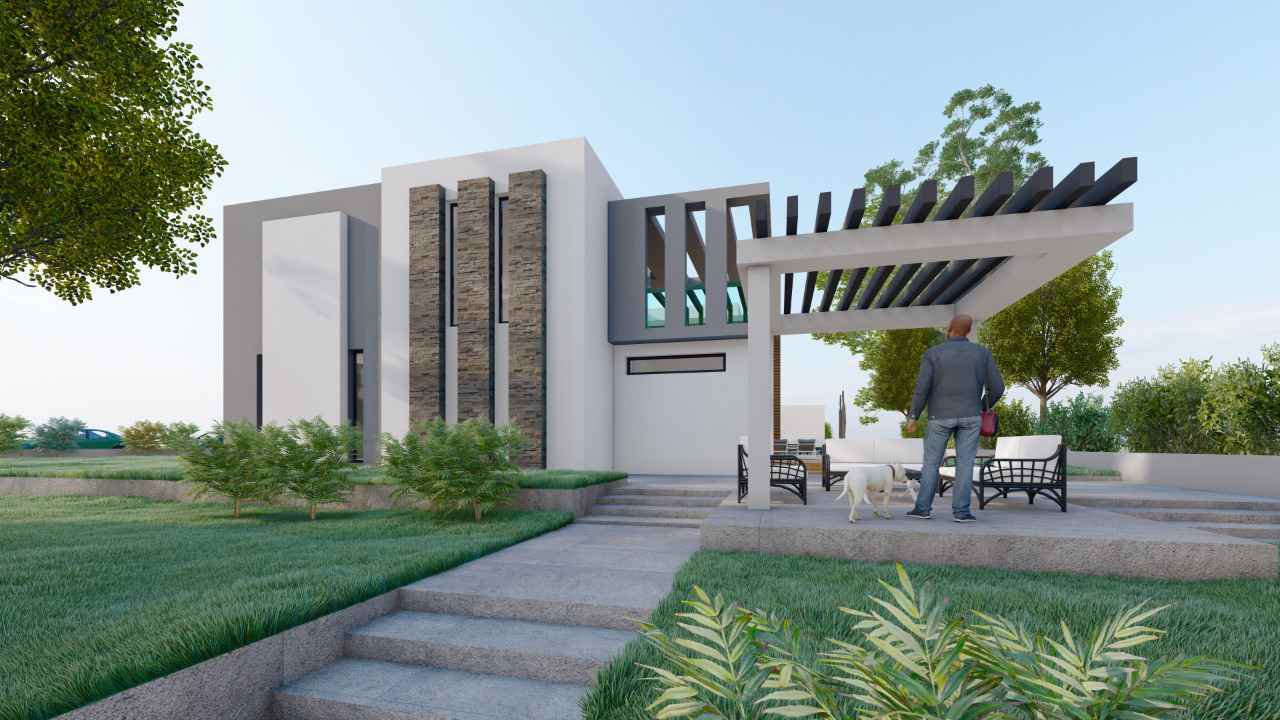 This 2 storey modern residence has an amazing strong central entertainment theme which comprises of a lap pool under a steel screen with a waterfall, a sunken lounge, outdoor bar and a concrete frame with steel sluts pergola. The house has a four garage on the ground floor, a cinema and an elegant wine cellar to mention a few spatial features.