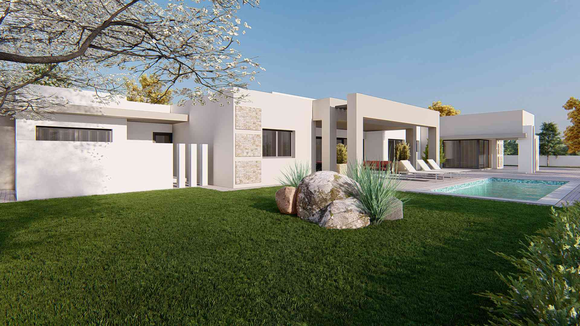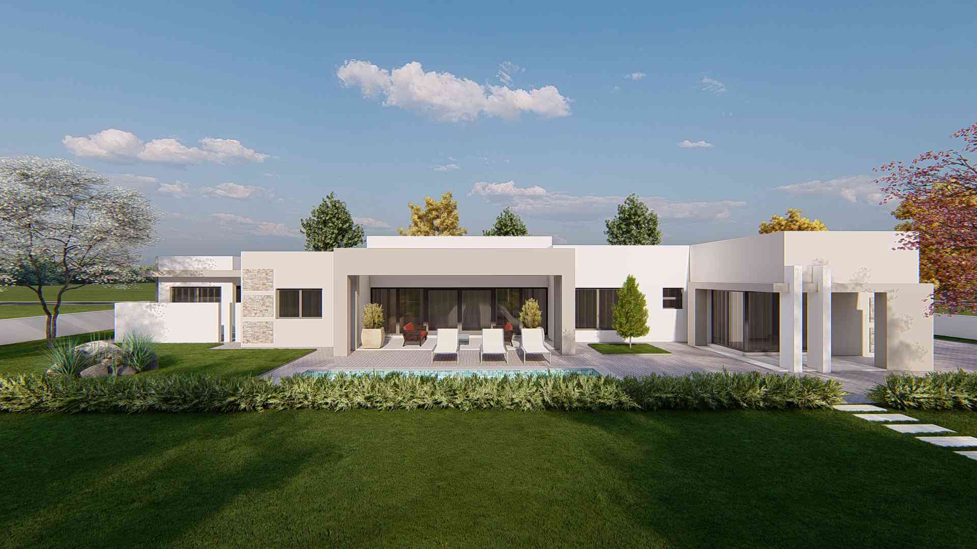 This modern single storey house has stylish two car carport, 3 spacious bedroom ensuite bedrooms, a semi open lounge and dining that flow to the patio which is crowned with a view of a swimming pool. The spaces in the house flow seamlessly with no door to the living areas yet wall are carefully placed to create privacy within the open spaces.