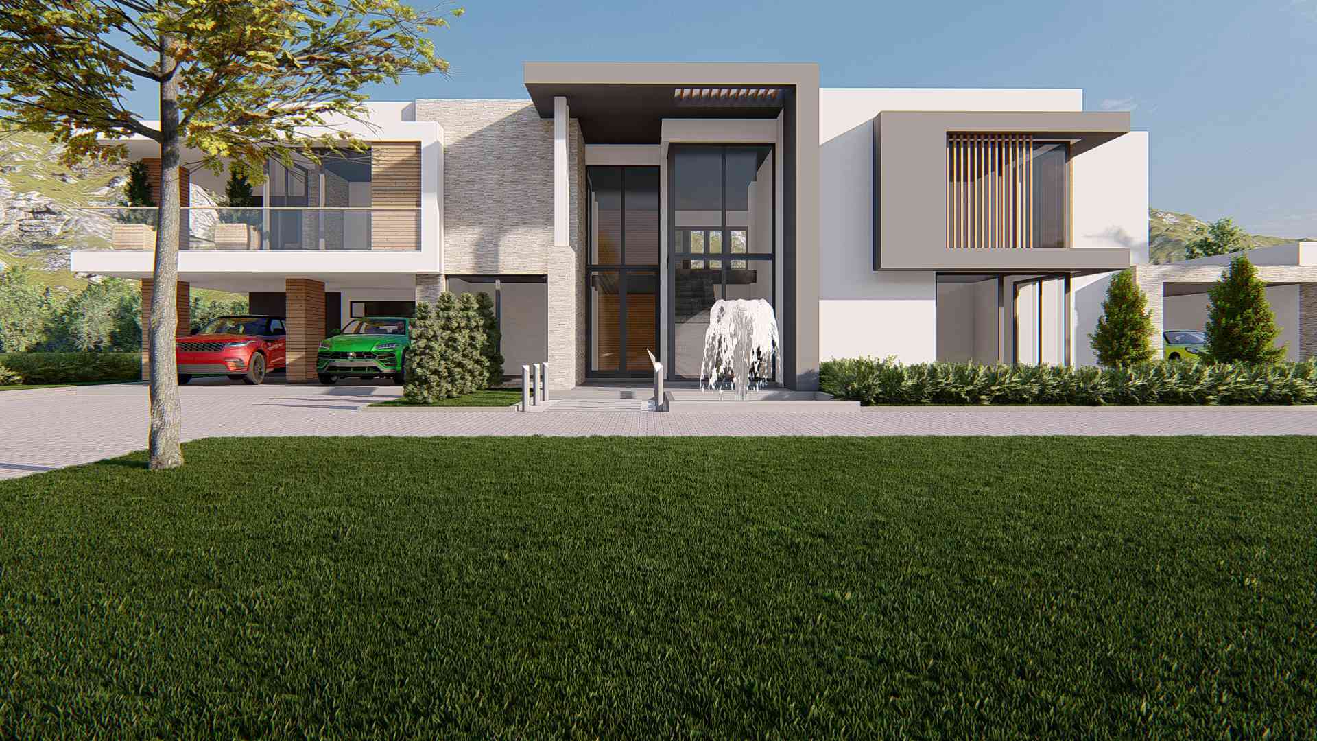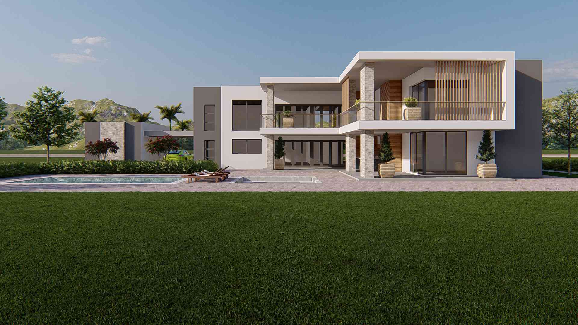 This rectilinear modern house sits on a farm with a hilly backdrop in Ermelo. Its have 4 spacious bedrooms; all ensuite and 3 carports, one linking the house to the garden cottage. The house has open plan lounge, dining and kitchen and separate Cinema room and study. The patio overlook the valley over the pool into the expanse of the Zwane farm.